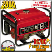 | 2800 Watt Gas Generator The best generator buy you’ll find anywhere! When the power goes out or you're camping miles away from the nearest outlet, this generator delivers all the power you need to run lights, power tools, electric appliances & more. Features a 6-1/2 HP overhead valve air-cooled four- stroke engine that pumps out 2800W peak (2600W continuous) of portable power, two 120V AC outlets, 12V DC outlet, DC trickle charger for charging your car battery, circuit breakers on all outlets, automatic voltage regulator, voltmeter & 4.1 gallon fuel tank for up to 7.8 hours (100% load) or up to 17 hours (50% load). Also has a hushed design for reduced noise. EPA certified. 23" x 17" x 17-1/2". Not available in CA. PUBLIC NOTICE: Natural disasters and power problems strike with little or no notice. So plan ahead and don’t get caught in the dark this year. |